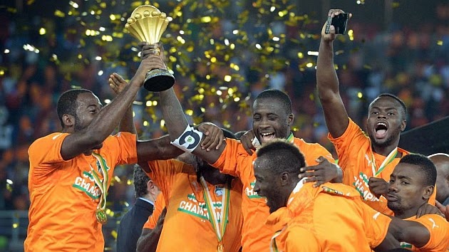 | Los jugadores de Costa de Marfil levantando el título de la CAN 2015 |